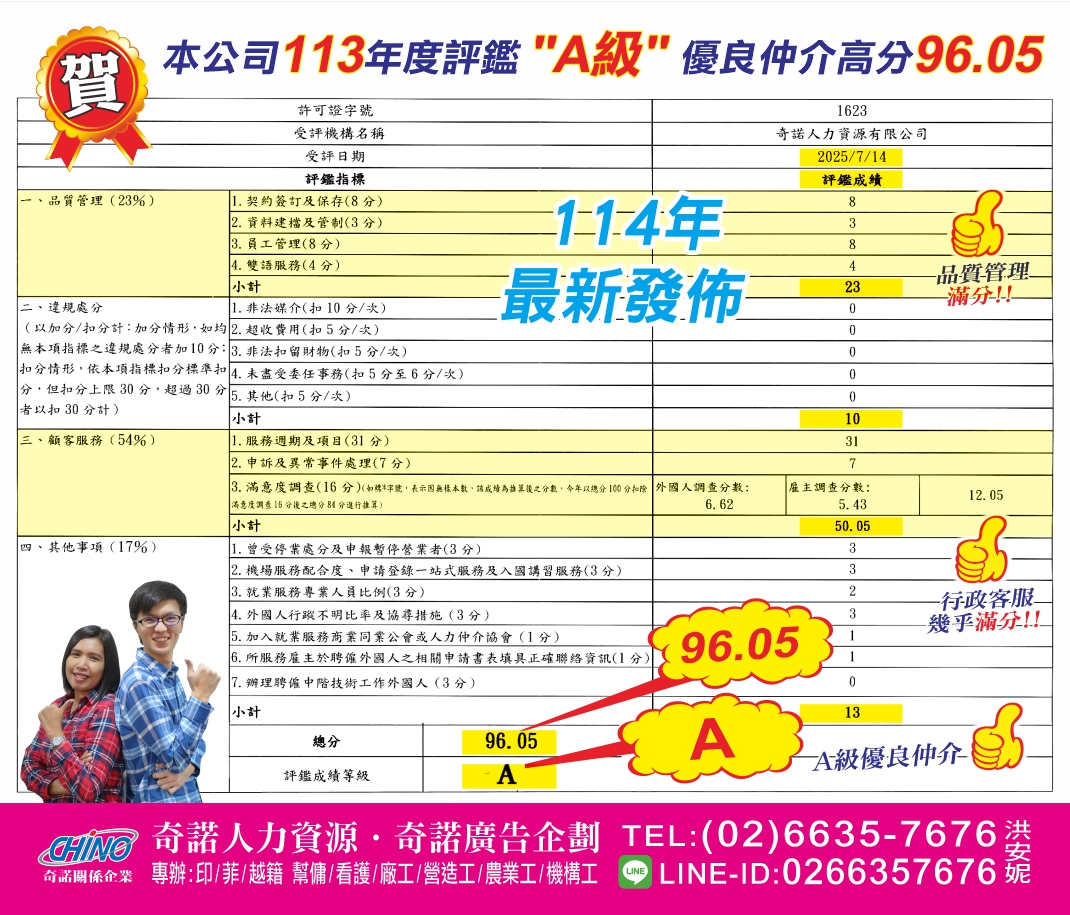 113年度榮獲評鑑A級最高榮譽-奇諾人力